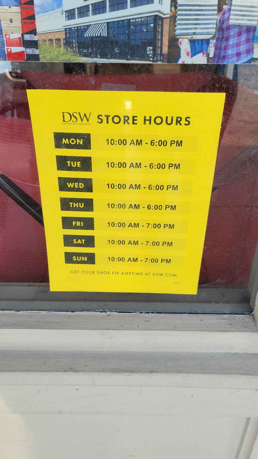 Here are DSW Designer Shoe Warehouse's opening hours, and please note that our hours may vary, so it's best to get in touch with us before planning your visit.